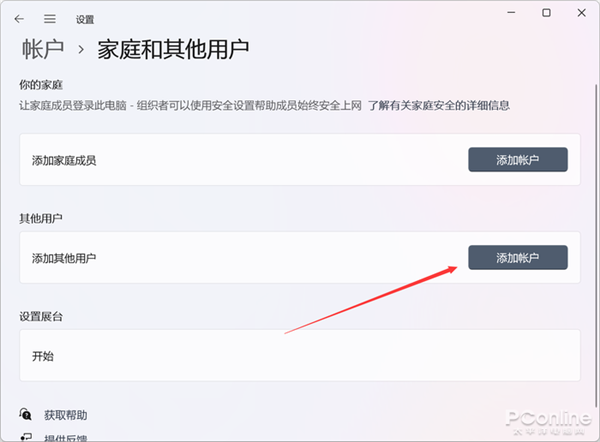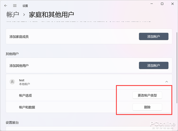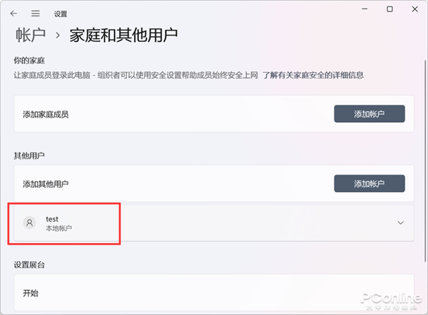 其实这两个功能是放在一起的。在设置面板中,我们进入到账户的相关设置,在家庭和其他用户的页面中,就可以看到本地账户的列表了。