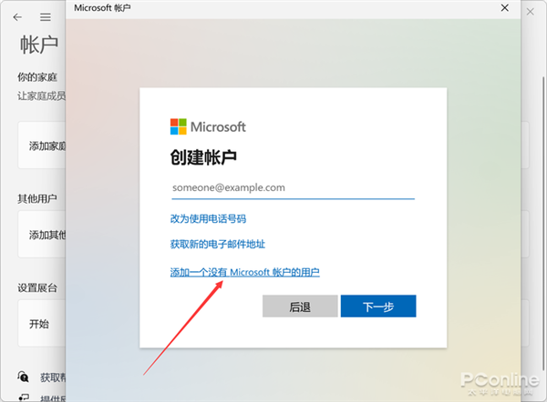 在弹出的窗口当中(必须吐槽一下这个窗口还是Win10风格),可以在下方选择不使用微软账户登录,接着按部就班填写用户名和密码等信息,就完成了。