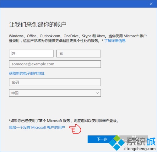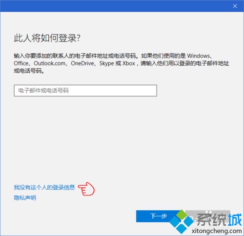 2、在弹出的向导对话框中,默认提示输入新用户的电子邮件或电话号码,最好是微软账号,在这里,由于是对“考试/测验”功能进行测试,因此不输入上述账号,而是直接点击“我没有这个人的登录信息”;