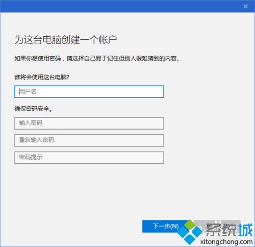 4、在接下来的界面中,依次输入用户名、密码、确认密码和密码提示,一个都不能略过,最后点击“下一步”;