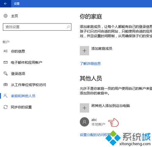 1、打开“设置”窗口,点击进入“账户”,在窗口左侧点击“家庭和其他成员”,然后在右侧点击“将其他人添加到这台电脑”;