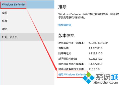 4、在“更新&安全”页面中,找到“Windows Defender”,点击右侧的“使用Windows Defender”;