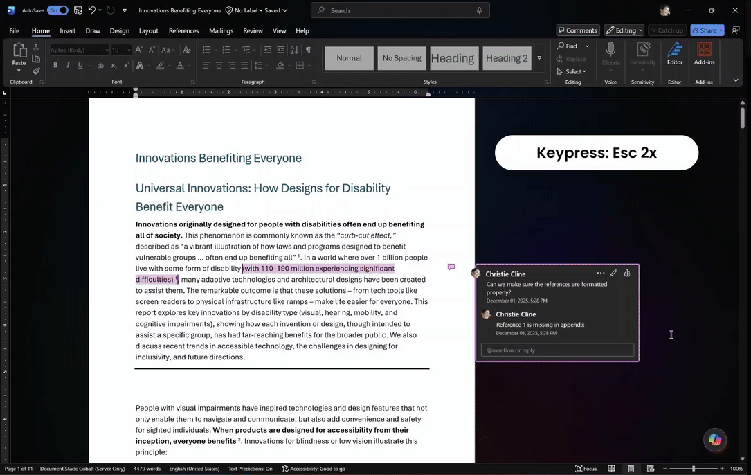 更直观的 Esc:按下后将按顺序返回上一级区域,例如从批注线程回到批注卡片,再从卡片回到文档,而非直接跳回正文。