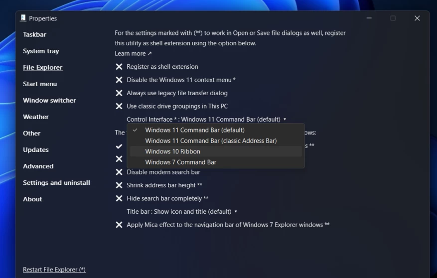 具体操作路径为:进入 ExplorerPatcher 的属性设置,找到“文件资源管理器(File Explorer)”菜单,取消勾选“Win11 命令栏(Command Bar)”,并转而选择“Windows 10 Ribbon 菜单”或“Windows 7 命令栏”。这一操作实质上是用旧版且更稳定的 UI 替代了不稳定的 WinUI 组件。