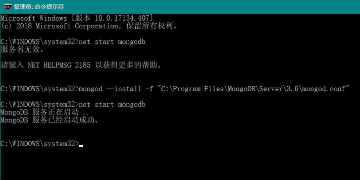 3、接着输入:mongod --install -f “C:Program FilesMongoDBServer3.6mongod.conf”