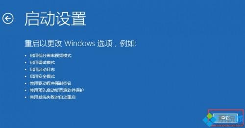 5、接下来在启动设置中,我们可以看到多选项(如禁用驱动程序强制签名),这时是不能选择的,Windows需要我们先重启来激活这些选项,我们点击重启即可;