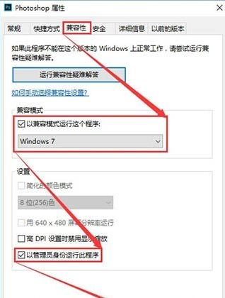 3、在PS属性对话框,点击切换到“兼容性”选项卡,点击勾选“以兼容模式运行这个程序”(建议选择Windows 7),接着在下面的设置栏中勾选“以管理员身份运行此程序”再点击确认(这个一定要勾选,不然还有可能出现配置错误),点击“确定”按钮保存设置即可。
