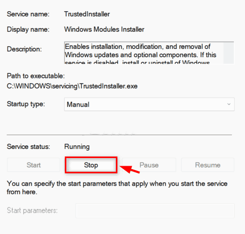 第 8 步:选择后,单击“开始”按钮启动 Windows Modules Installer 服务。
