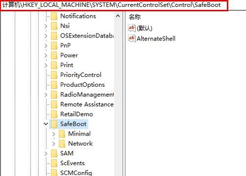 5、然后依次展开文件夹:HKEY_LOCAL_MACHINE\SYSTEM\CurrentControlSet\Control\SafeBoot。