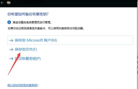 4、这里随便选择一项保存“恢复密匙”,然后点击“下一步”,如下图所示;(注意:恢复密钥很重要,如果密码忘记可以恢复,丢失可能导致你数据无法找回。)
