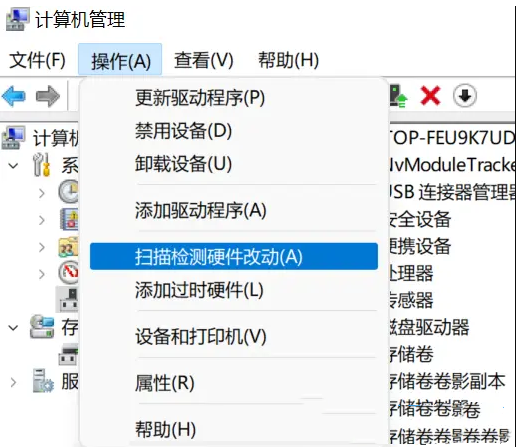 4、返回到计算机管理窗口,点击顶部的【操作】,打开的下拉项中,选择【扫描检测硬件改动】。