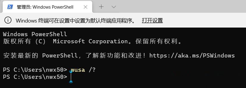2、管理员: Windows powershell窗口,输入【wusa /?】命令,并按回车键;