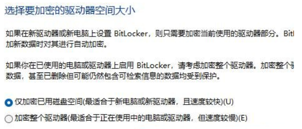 7、选择要加密的驱动器空间大小,这里选择【仅加密已用磁盘空间(最适合于新电脑或新驱动器,且速度较快)】。