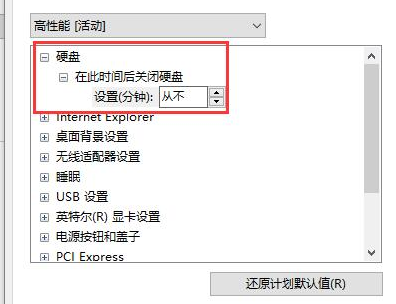 5、展开【硬盘】项目,将在此时间后关闭硬盘更改为【从不】。