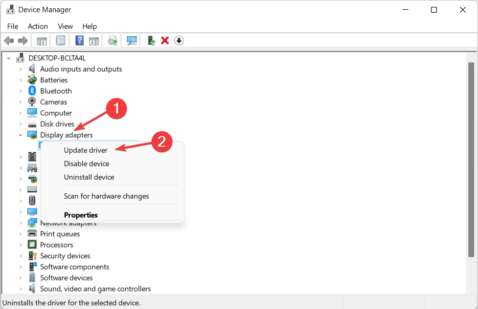 接下来,单击显示适配器选项并右键单击NVIDIA驱动程序,最后,选择更新驱动程序并按照屏幕上的步骤操作。