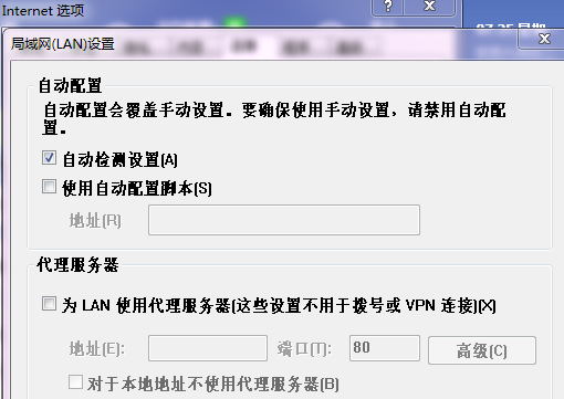 4、将“为LAN使用代理服务器(这些设置不用于拨号或VPN连接)”前面的勾去掉,若 【自动检测设置】已勾选则取消勾选,若【自动检测设置】未勾选则将其勾选,然后点击确定。