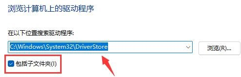 6、在其中输入【C:\Windows\System32\DriverStore】,记得要勾选【包括子文件夹】,最后点击【下一步】,系统就会自动为我们扫描并修复U盘驱动了。