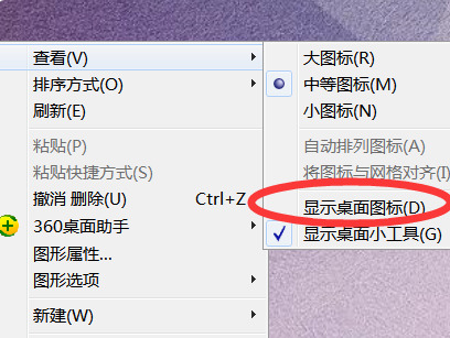 3、然后在打开的“查看”下拉选项中点击“显示桌面图标”选项。