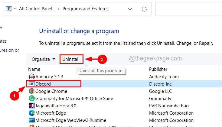 第 3 步:如今“程序功能和”窗口出现在了屏上,您应当从程序页面上查找 Discord 应用程序。