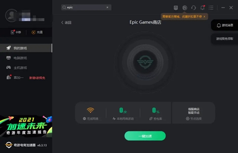还可以使用奇游加速器,点击一键优化,启动软件后可以直接体验,玩家可以借助奇游加速工具来优化网络,对启动软件时进行加速解决问题,然后点epic,直接就可进入软件中,即可下载游戏体验。