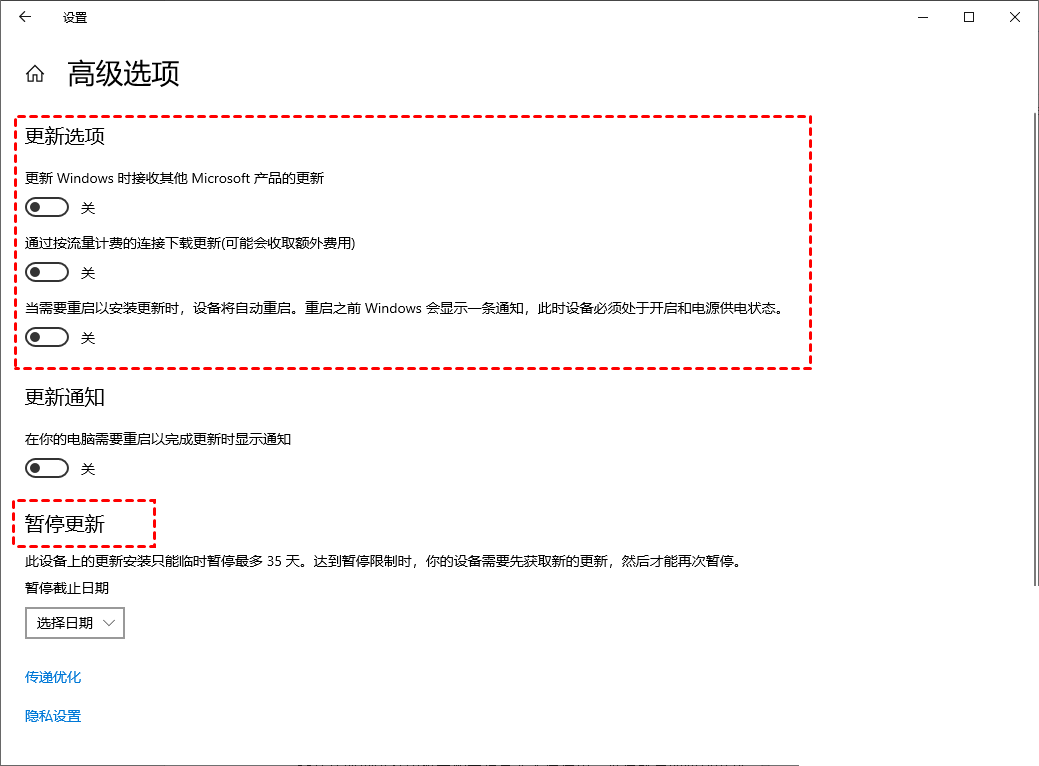 3、在高端选项中,大家可以将“升级选项”中新项目所有关闭,或是选择“暂停升级”,但此暂停升级最多只有暂停35天,做到暂停限定后先要获得一个新的升级,之后才能再度暂停升级。