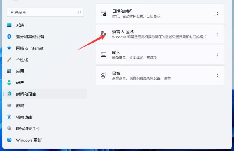 3、开启的时间和语言窗口中,寻找并点击语言&区域(Windows 和其他应用根据自己所属的区域设置日期和时间的格式)。