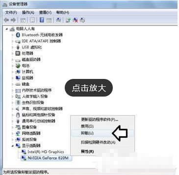 6、显示电源适配器>右键点一下电脑显卡机器设备(通常是独立显卡)>卸载。