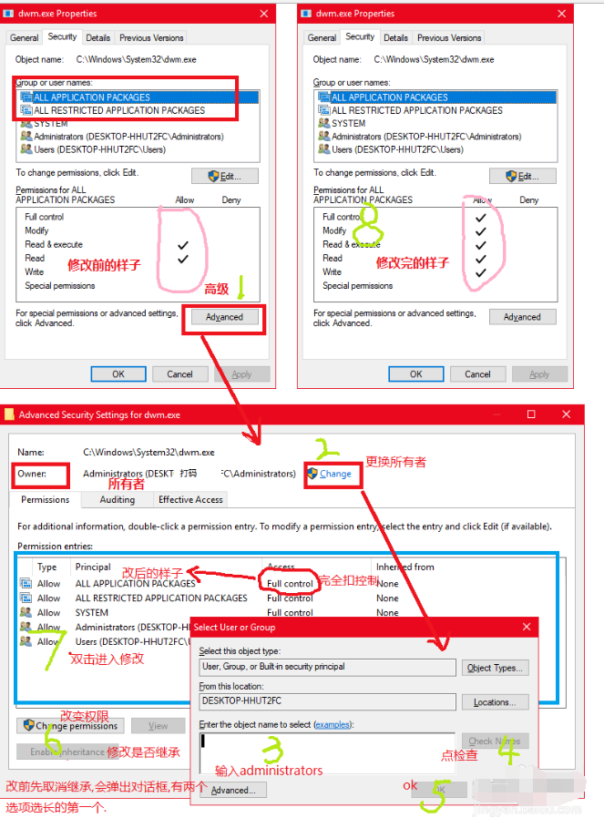 方法为点击高级, “所有者”改成adminstrators(就是当前用户),你成为所有者后就可以对下面的进行修改,然后点击下面的修改权限,就可以对蓝框中的权限进行修改了。