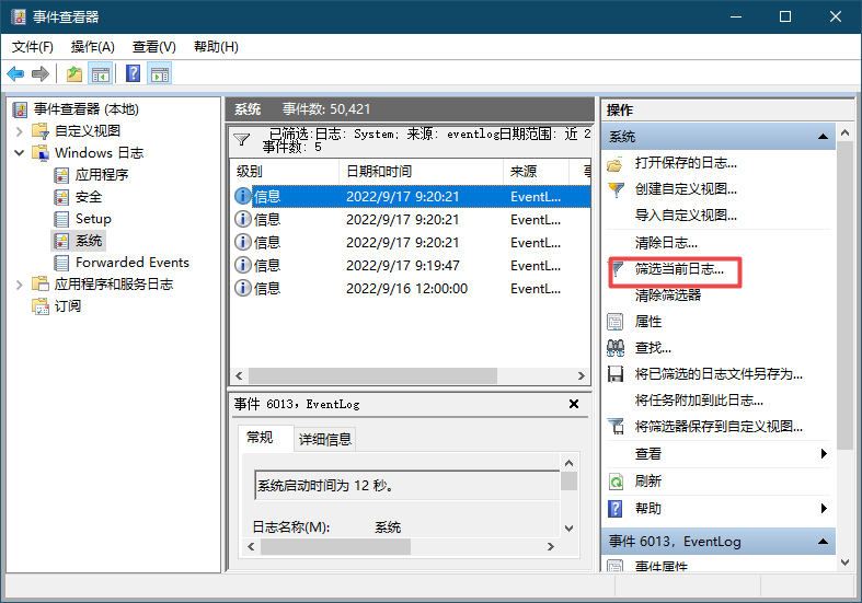 3、在系统日志中,点击筛选当前日志。因为的日志比较大,我们需要查看是否有开机与关机的日志信息。