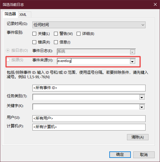 4、在日志筛选器中选择事件来源为eventlog