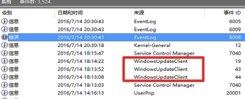 7、在关机日志的前面我们查看一下在关机重启的前几分钟,电脑的运行情况,运行日志。如下图,是因为的WIN10自动更新引起的自动重启,将自动更新关闭即可。