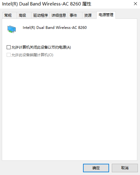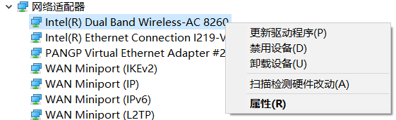(2)先点击Intel Dual Band Wireless-AC 8260(WLAN所用的),右键查看属性-电源管理,(或者 网络和Internet设置-状态-更改适配器-WLAN-属性-配置-电源选项,同样可以修改这一设置);