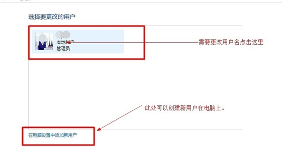 4、打开 更改账户类型 后,我们就进入了管理账户界面,点击最下方在电脑设置中添加新用户,也给电脑增加多个用户,今天不详述。 我们点击需要更改的用户名。