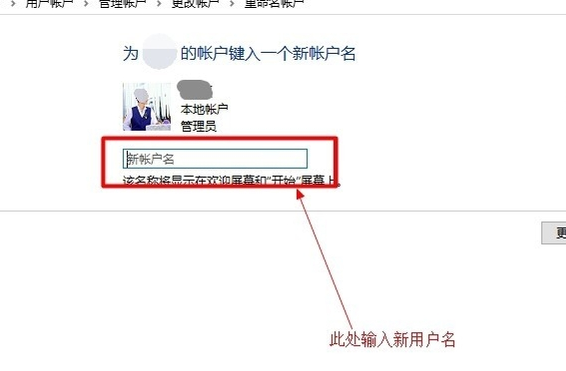 6、我们点击更改账户名称后会进入以前界面,提示重命名账户,这里就可更改电脑用户名了。 提示此处可使用中文哦!