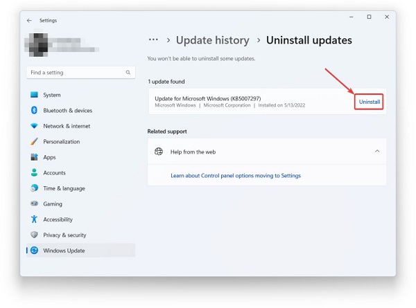 5、通过单击新弹出窗口上的“卸载”来确认删除 Windows 11 更新。