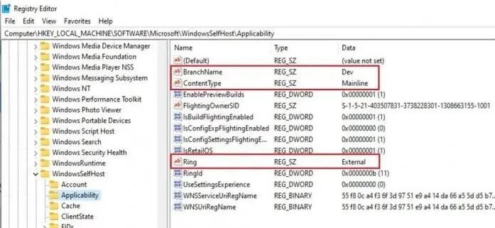 4、随后导航栏到 HKEY_LOCAL_MACHINE \ SOFTWARE \ Microsoft \ WindowsSelfHost \ Applicability 途径,将 BranchName 键里的文字改为 Dev,将 ContentType 键里的文字改为 Mainline,将 Ring 键里的文本改为 External之后便也可以进行win11升级。