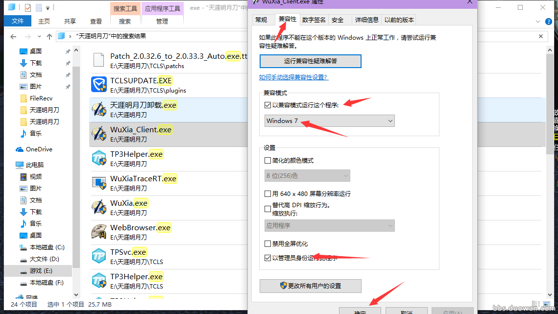 在删除1所说的3个文件夹的情况下,在天刀根目录右上角搜索exe,将所有天刀运行相关的程序全部:右键-属性-兼容性-以win7运行,并赋予管理员权限。