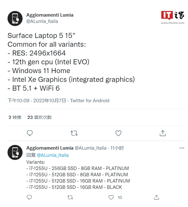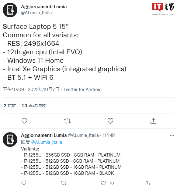 IT之家了解到,据爆料者 @Aggiornamenti Lumia 提供的信息显示,Surface Laptop 5 包含 13.5 英寸和 15 英寸两个版本,今搭载英特尔处理器。