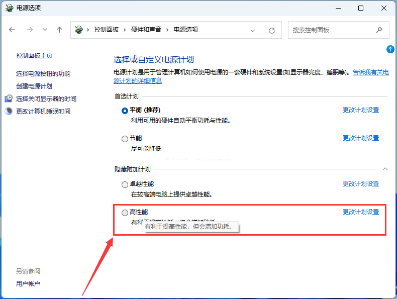 3、电源选项窗口,展开隐藏附加计划,选择【高性能(有利于提高性能,但会增加功耗)】。