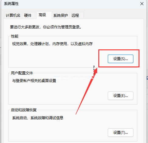 4、系统属性窗口,切换到【高级】选项卡后,再点击性能(视觉效果,处理器计划,内存使用,以及虚拟内存)下的【设置】。