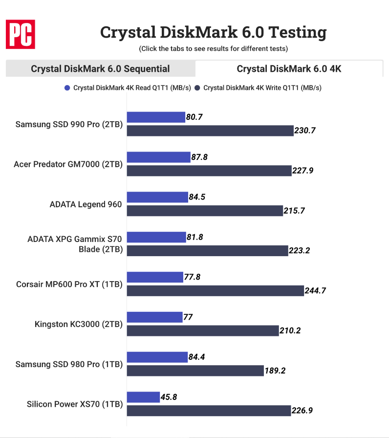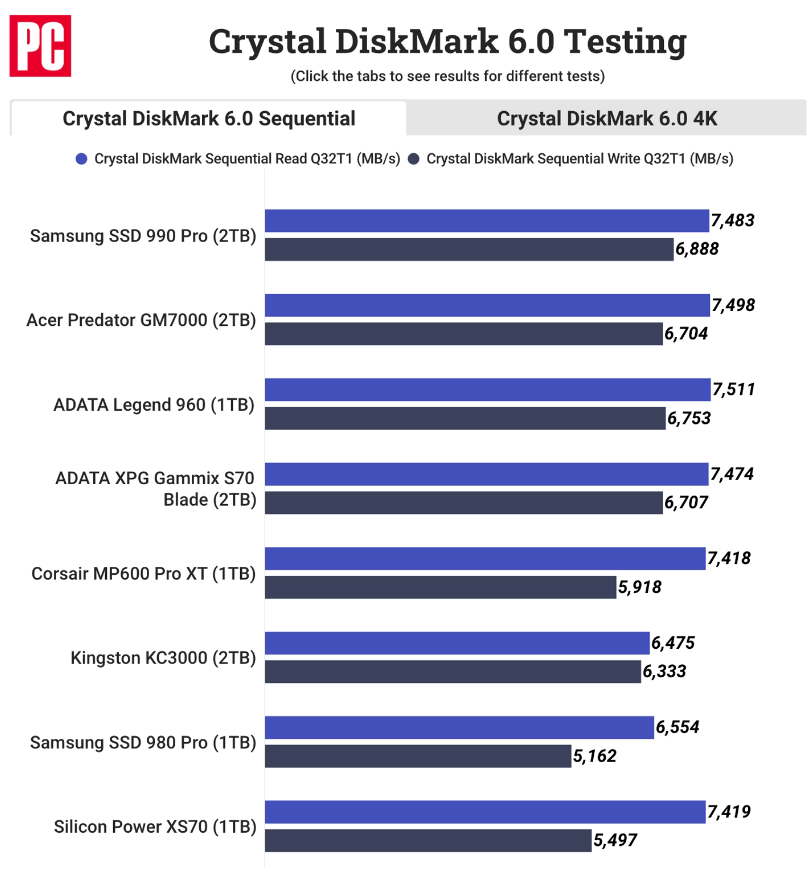 以下是外媒 PC 测试的 990 PRO 顺序和随机读写速度以及与其他品牌的对比: