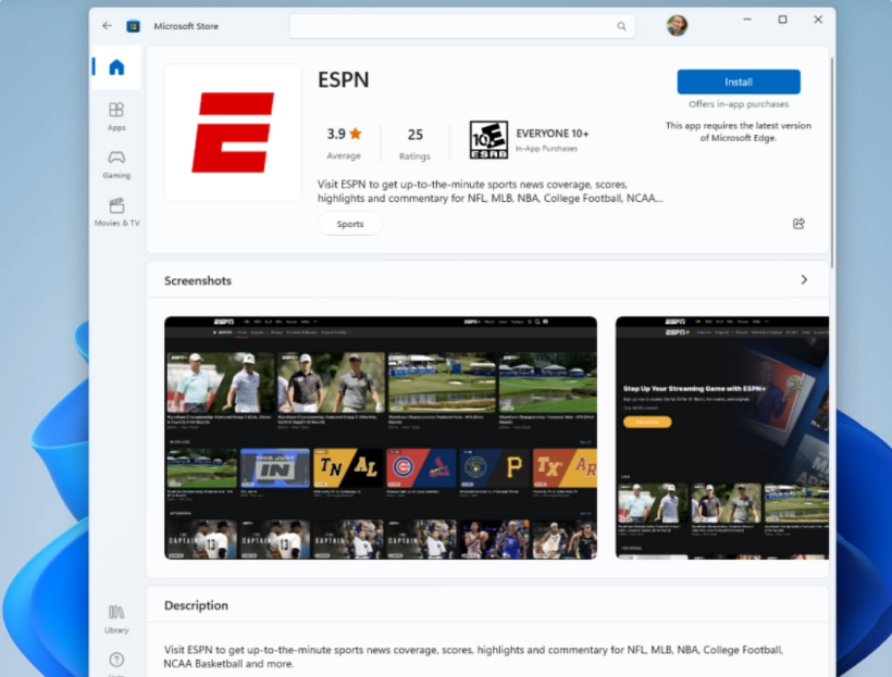 对于世界各地的球迷,微软宣布 ESPN 应用已在全球 239 个市场的微软应用商店中推出。该应用加入了不断增长的娱乐产品目录,包括 Hulu、Netflix、Discord、Vudu、Tubi、Crunchyroll、TikTok、Disney + 和 Amazon Prime Video,扩展了游戏目录,使 Windows 成为用户追求的娱乐和体育目的地。