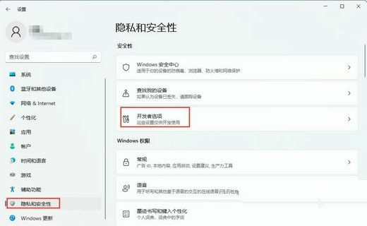 2、进入界面后,在界面中找到并打开隐私和安全性选项,之后左边会出现它的列表,在列表中进入开发者选项的页面。
