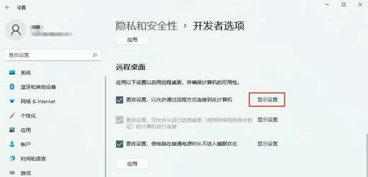 4、随后,在页面中找到远程桌面功能,然后点击以允许通过远程方式连接到此计算机右边的显示设置按钮。