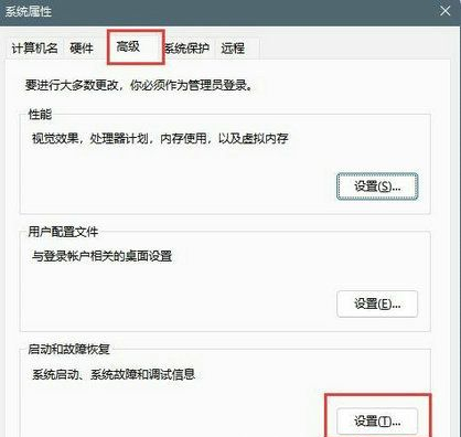 5、再进入系统属性的界面,选择高级选项,然后在页面中按启动和故障恢复右边的设置功能。