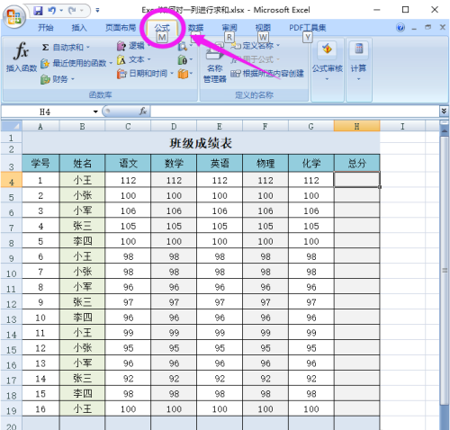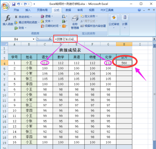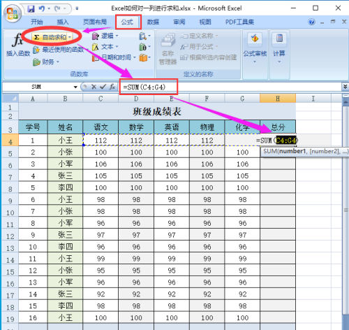 再单击公式下面的“自动求和“选项,然后会出现求和函数公式,如上面函数公式 ”=SUM(C4:G4)“中 C4代表第一个加数的坐标, G4代表最后一个加数的坐标。
