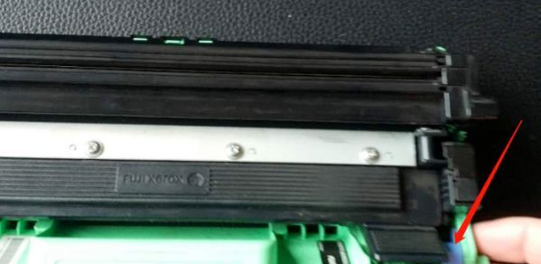3、扣住这个绿色的凹槽,往外拉,把鼓芯墨盒取出。