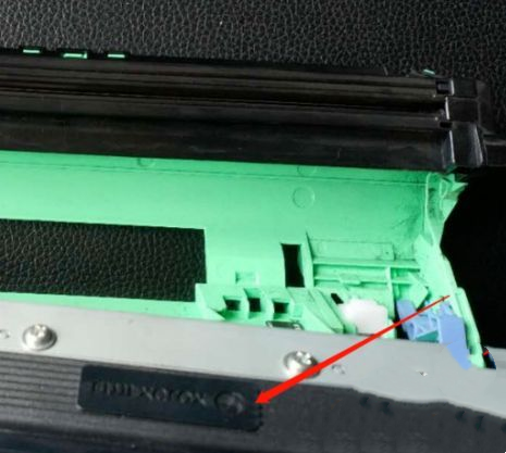 7、整体装好后,将整个装入打印机中,鼓架上有一大一小吐出来的滑竿,小的在前,大的在后,对准打印机的凹槽,往下面放,按倒听到卡扣声就说明安装到位。