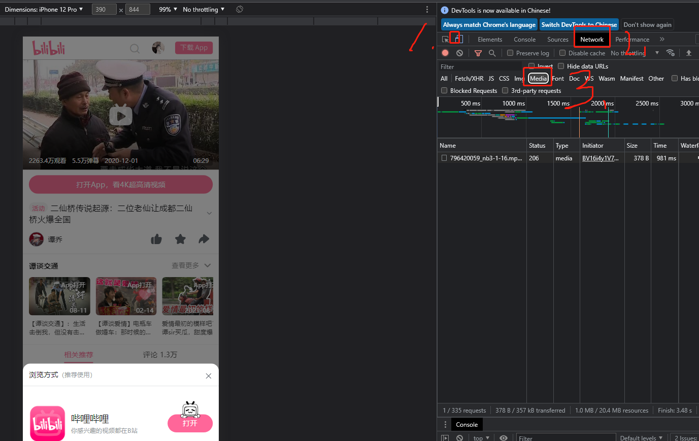 1、按下F12(笔记本按fn+F12)进入开发者模式如下图,按步骤切换到手机模式。点击 network 和 media,如下图所示: