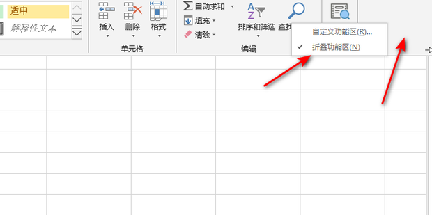 在上方工具栏内空白处右键,可以看到折叠功能区的选项是勾选的取消勾选即可。